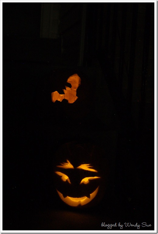 Zach asked for a Bat, so Brad carved a bat in his pumpkin. Seth wanted a Vampire…so I attempted a vampire, although looking at it now, it looks a little more like a wolf-man than a vampire. Oh well…they were happy. And they were thrilled to wake up this morning to find the pumpkins still on the porch. We had a sad pumpkin smashing incident last year that apparently left our kids scarred…so nice of a few teenage neighborhood boys...